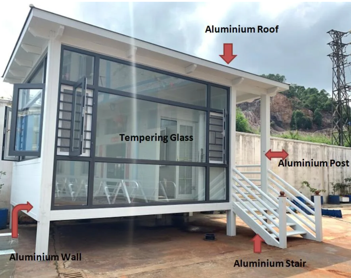 1) The whole house is made of aluminum including the internal or external walls, roof panles, posts (frame) and flooring.